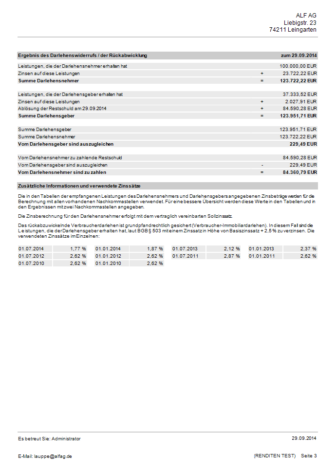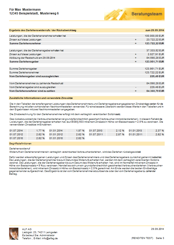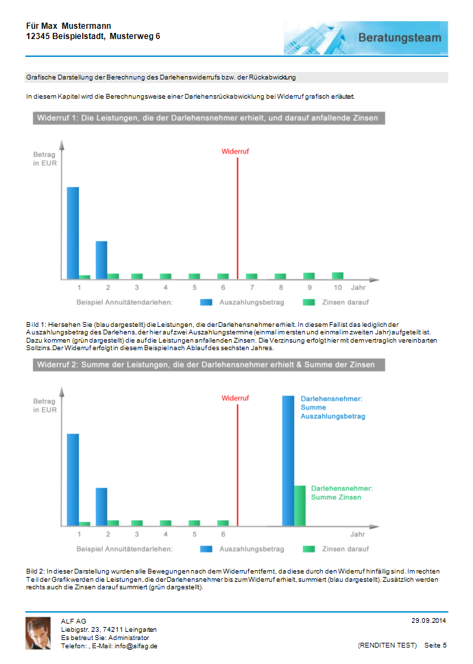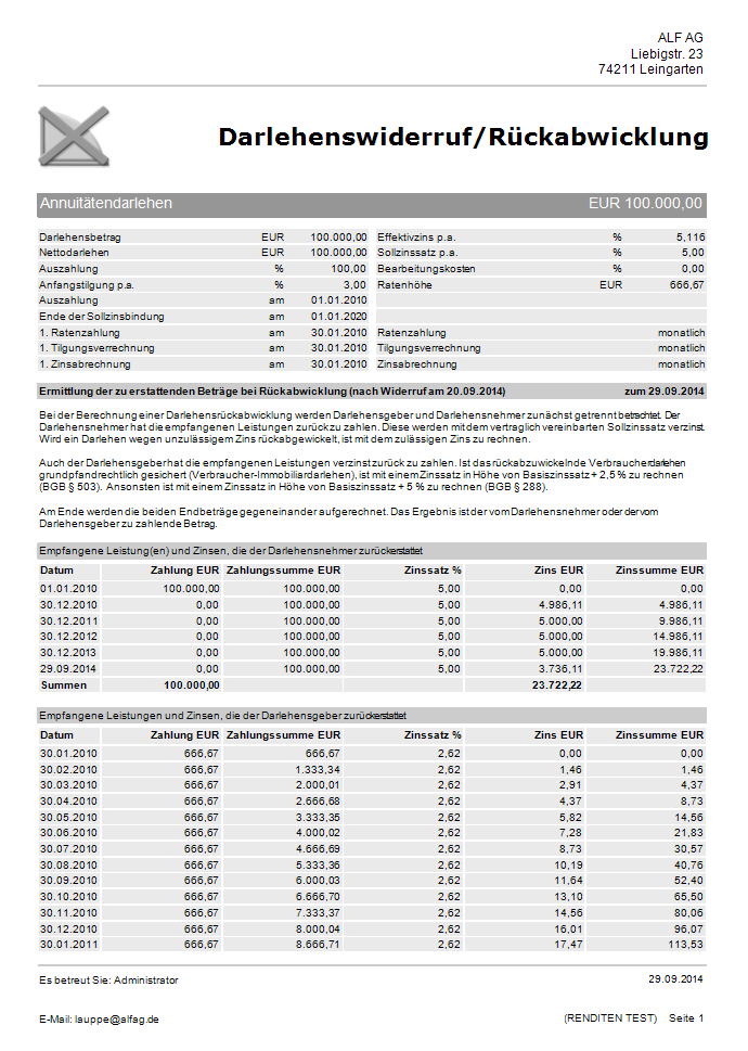 Für ein in ALF-EFZ erfasstes Annuitäten-, Tilgungs-, Fest-, Forwarddarlehen oder einen Ratenkredit berechnen Sie mit Modul Widerruf mit wenigen Klicks einen Darlehenswiderruf. Das Modul ermittelt auch Sonderfälle, z. B. die Rückabwicklung bei bereits geleisteter Vorfälligkeitsentschädigung sowie die Rückzahlung von Bearbeitungsgebühren. Verwenden Sie auch Modul K – Komfort, erhalten Sie die erforderlichen Basiszinssätze per Mausklick vom ALF-Server. Die Broschüre enthält auf wenigen Seiten die wichtigsten Informationen zum neuen Modul W – Widerruf.